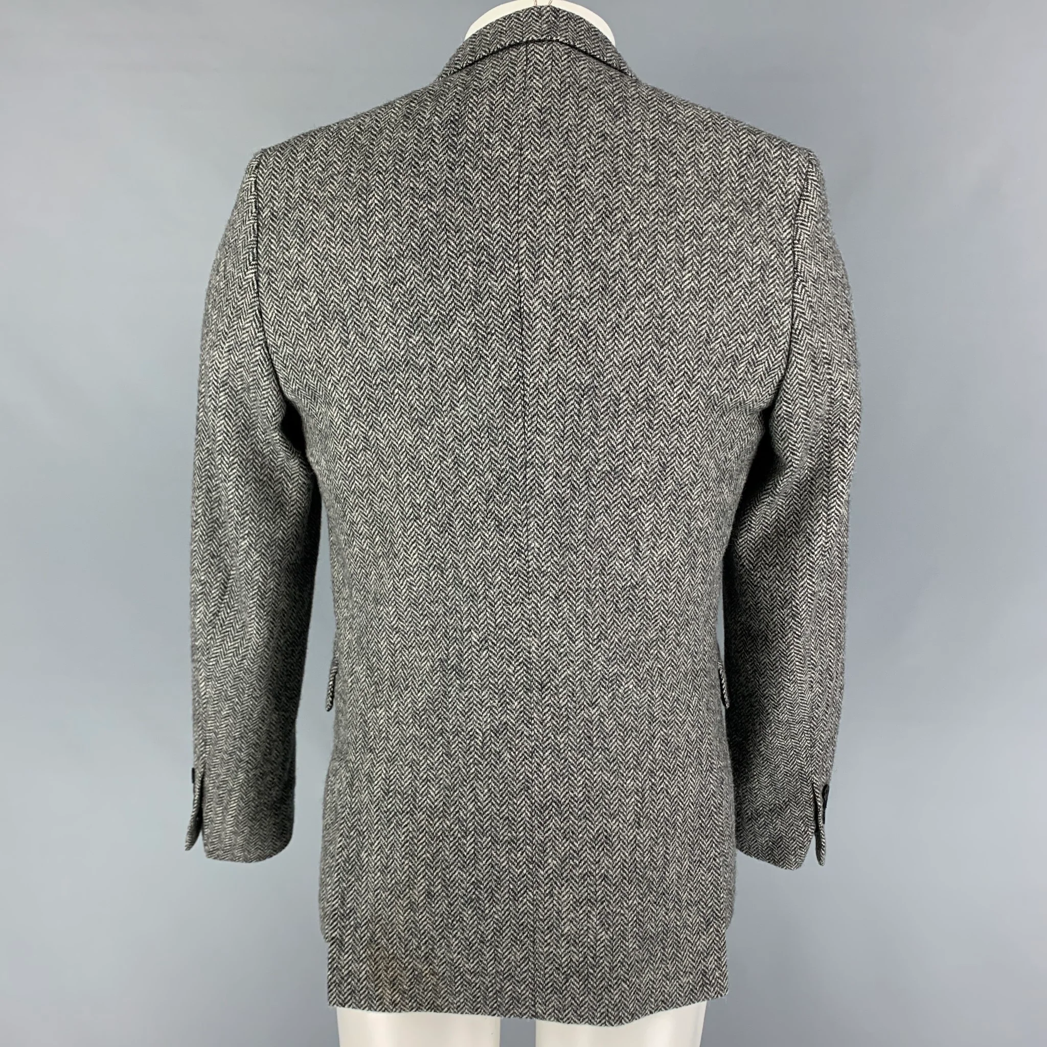 AMI by ALEXANDRE MATTIUSSI sport coat comes in a grey & black herringbone wool with a full liner featuring a notch lapel, flap pockets, double back vent, and a double button closure.