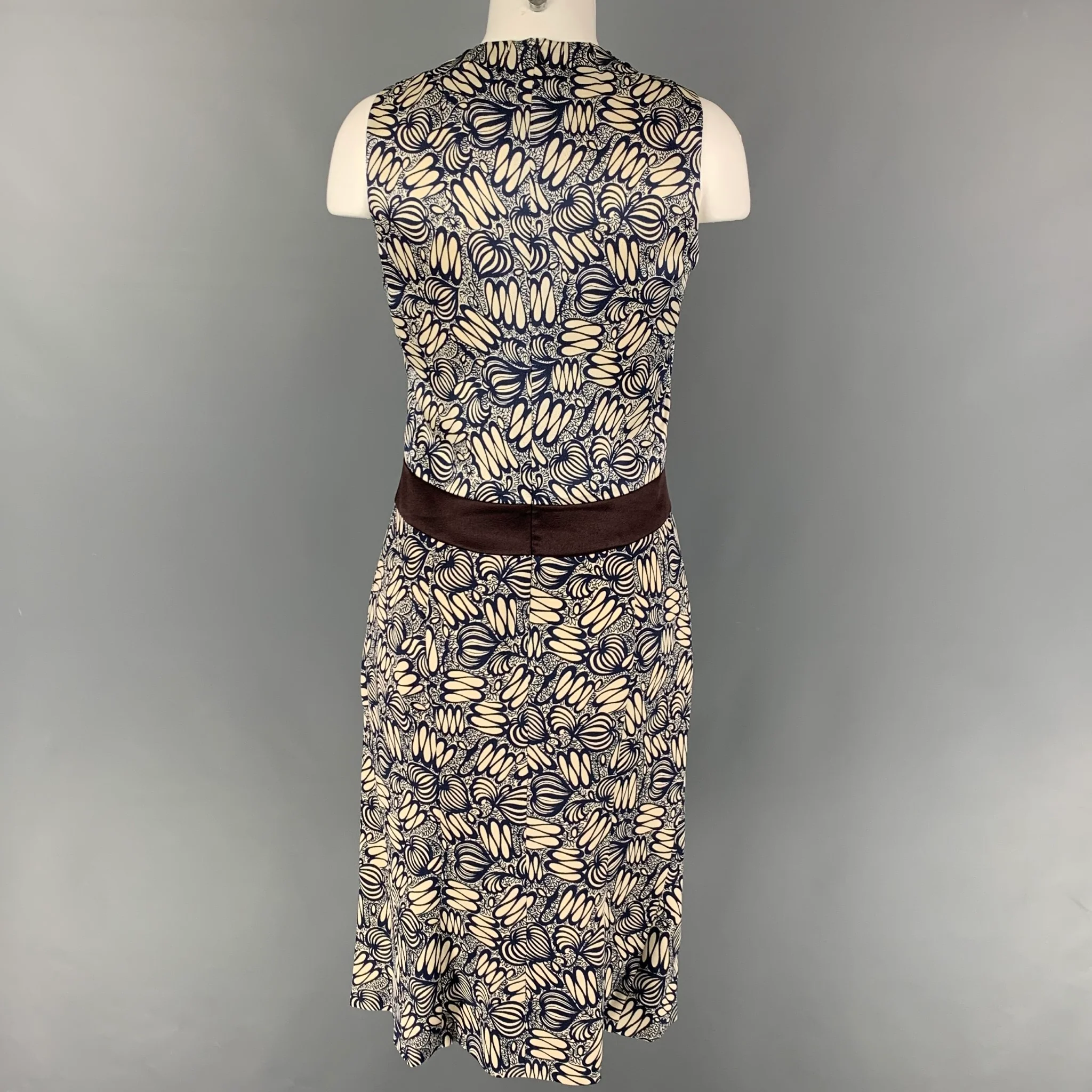 CELINE dress comes in a navy & white abstract print silk featuring a shift style, brown velvet trim, sleeveless, and a back zip up closure. Made in France.