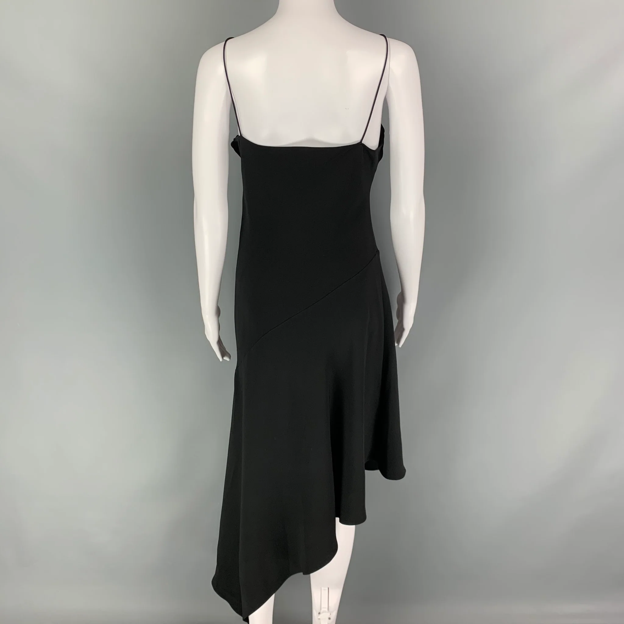 CELINE dress comes in a black stretch silk featuring a asymmetrical design, spaghetti straps, and a slip on style.