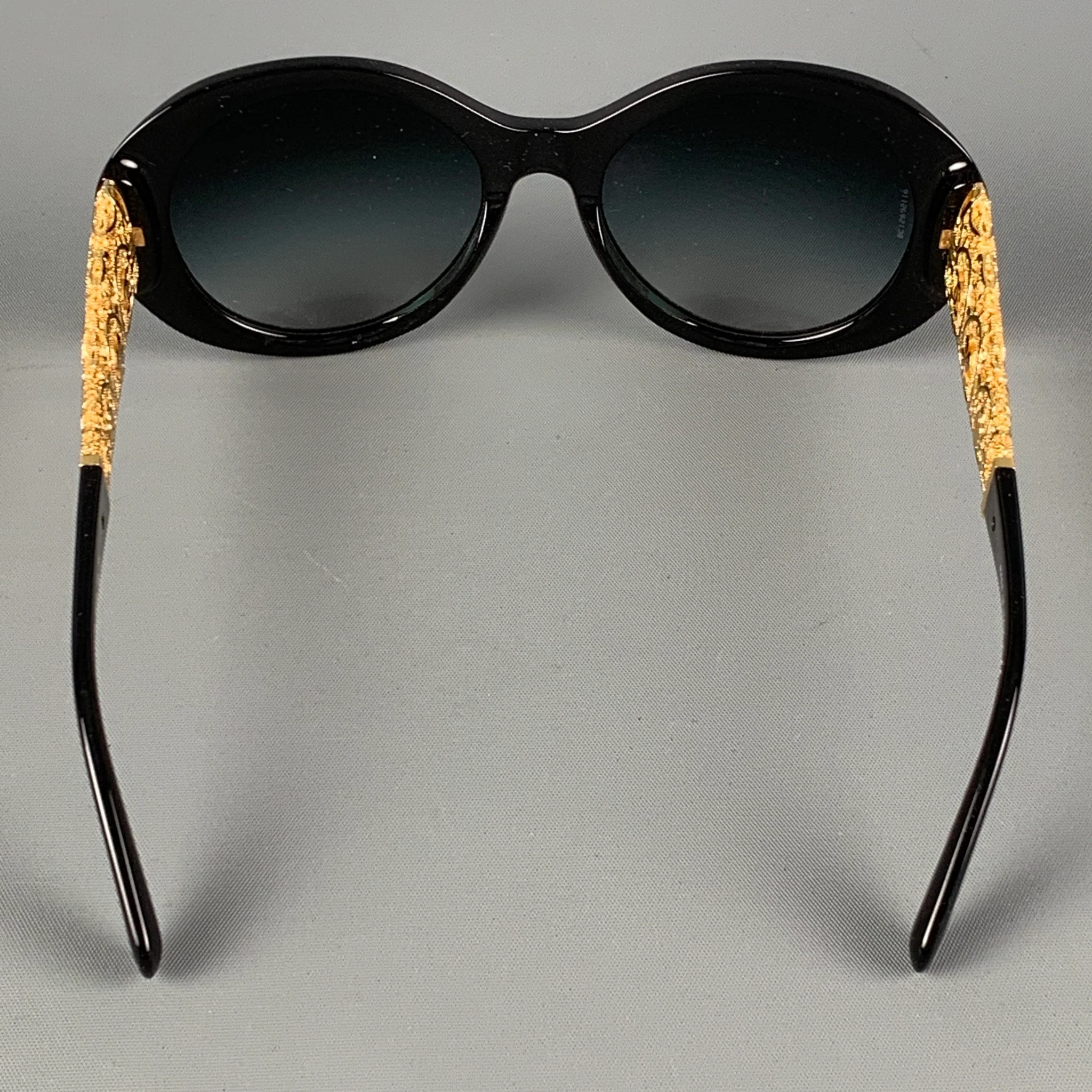 CHANEL 'Bijou' sunglasses comes in a black acetate featuring a metal crafted gold tone 'Camellia' floral motif design and a oval shaped tinted lenses. Includes case. Made in Italy.