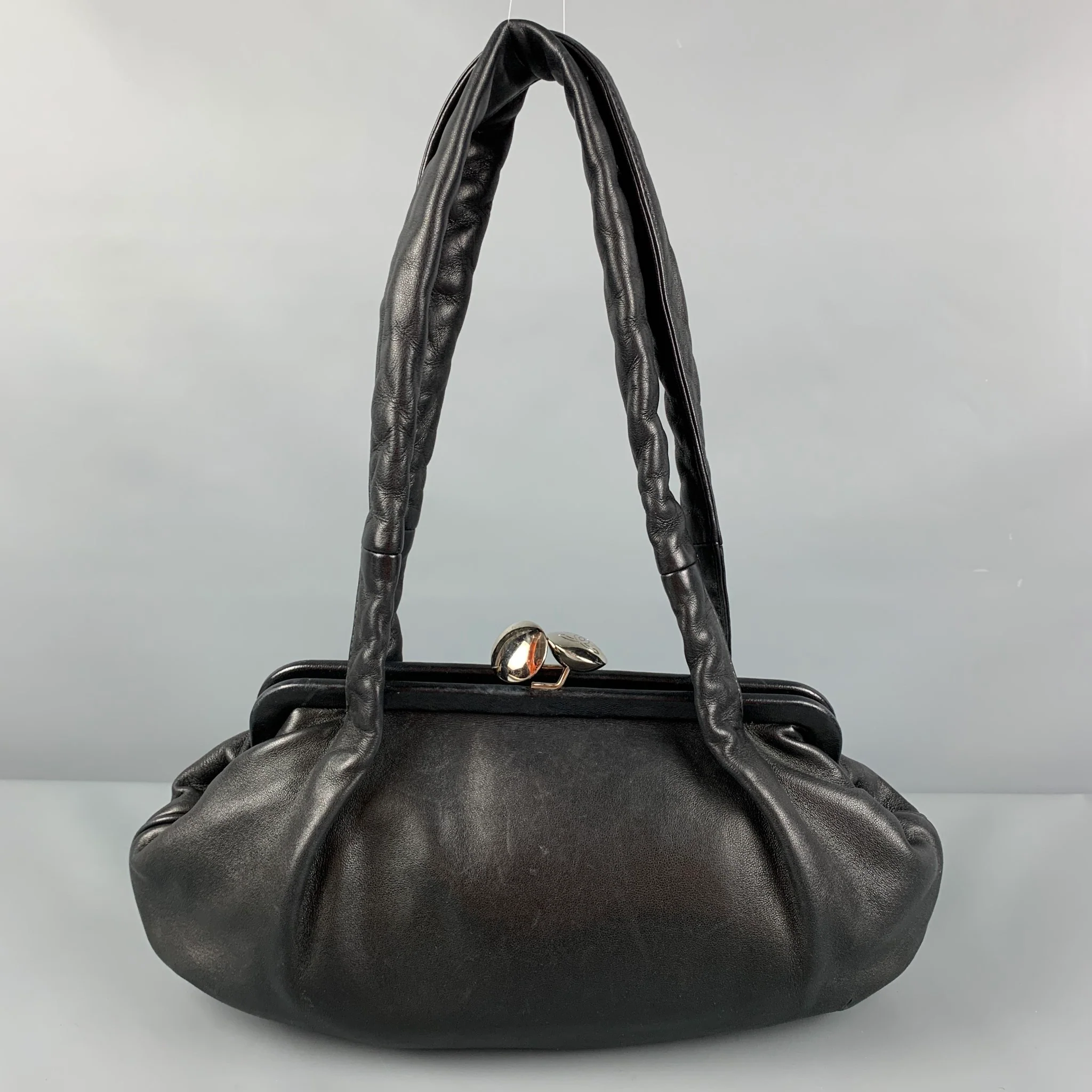 CHANEL bag comes in a black leather featuring a 'CC' embossed design, top handles, silver tone hardware, inner pocket, and a kiss-lock closure. Made in Italy.