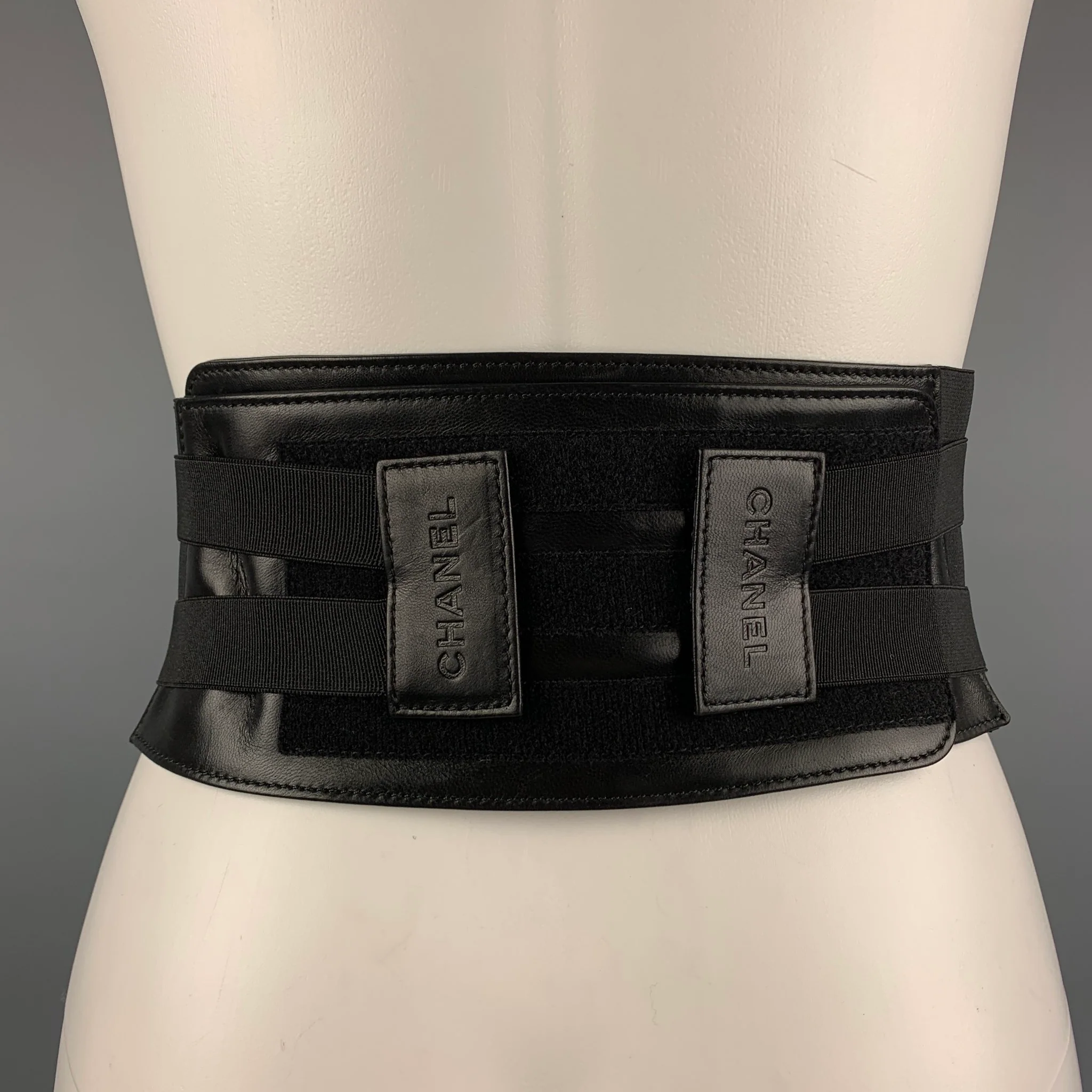 CHANEL FW 11 belt comes in a black quilted leather featuring elastic sides, logo detail, and a hook & loop closure. Comes with box. Made in Italy.