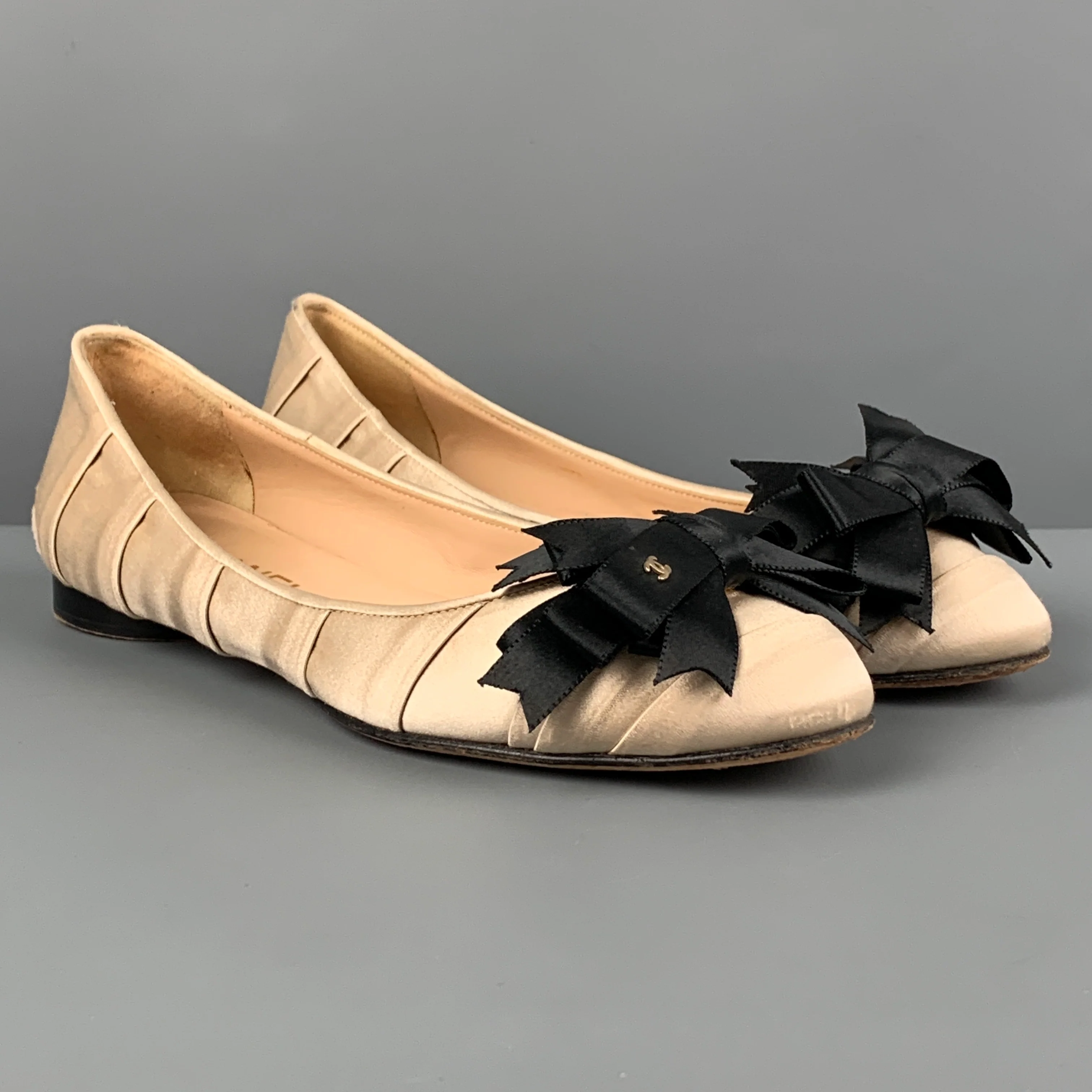 CHANEL Size 7.5 Beige Silk Pleated Flats