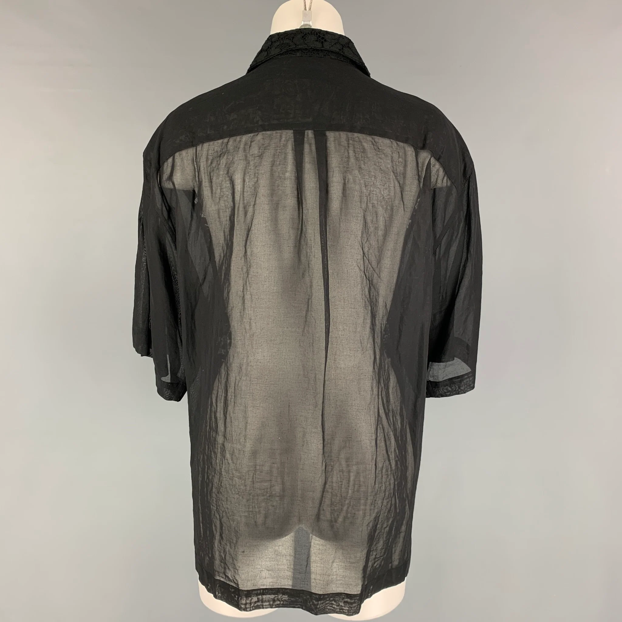 DRIES VAN NOTEN shirt comes in a black lace cotton blend featuring see through short sleeves, loose fit, patch pocket, payette sequin details, and a hidden placket closure.