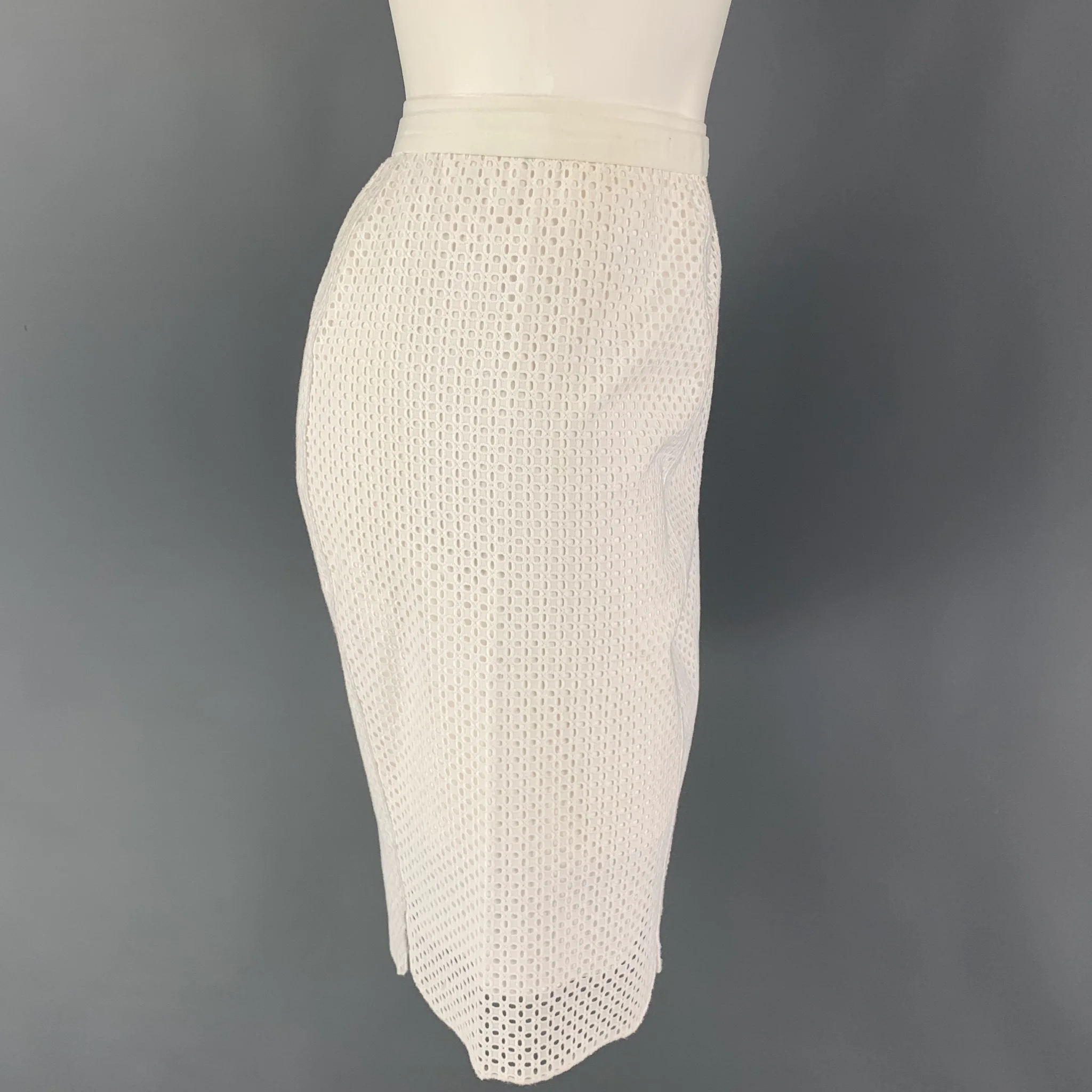 ELIE TAHARI skirt comes in a white eyelet cotton with a slip liner featuring a pencil style and a back zip up closure.