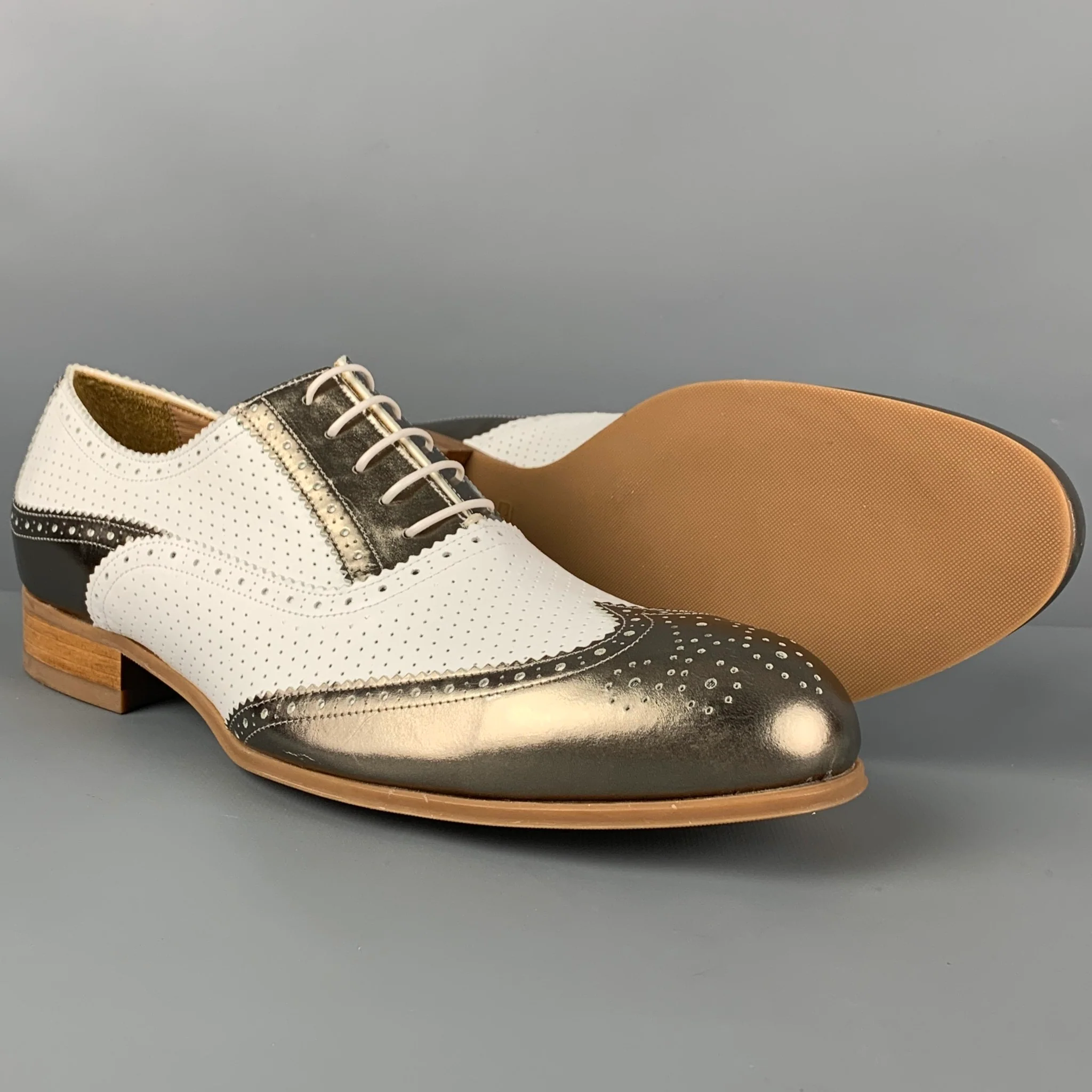 EMPORIO ARMANI Size 10 White Metallic Perforated Leather Spectator Lace Up Shoes