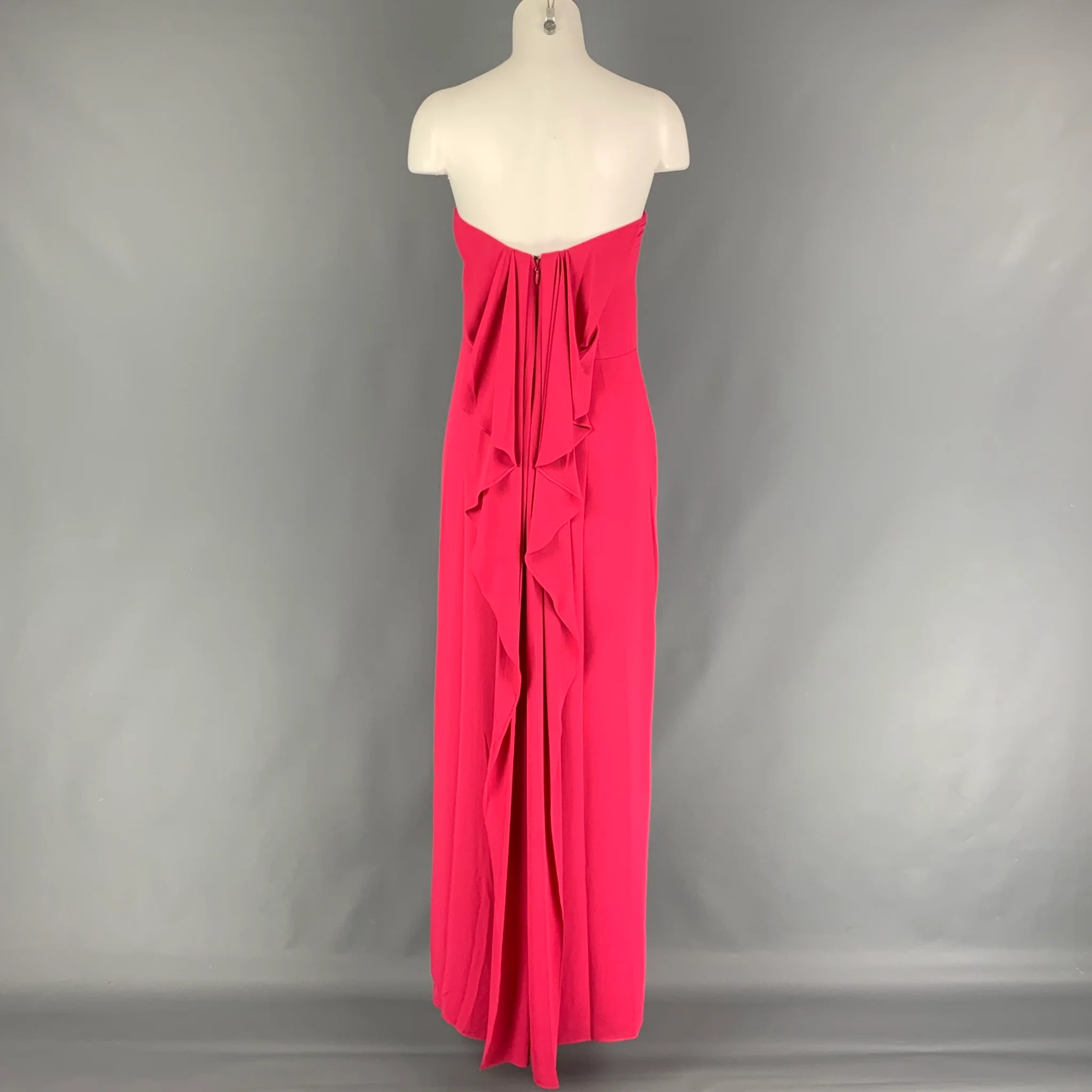 HALSTON HERITAGE dress comes in a pink polyester featuring a strapless style, high side slit, cascading drape detail, inner bustier, and a back zip up closure.