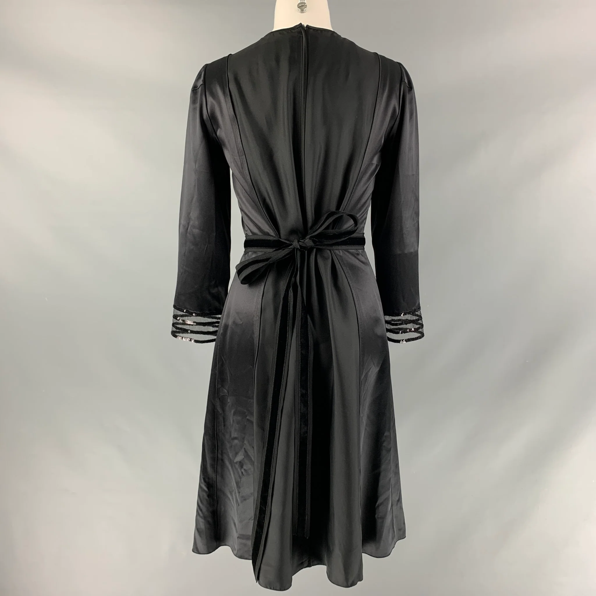 MARC JACOBS long sleeve dress comes in a black silk fabric featuring a tulle panel collar detail, sequin trims, back zip- up closure and velvet tie at back.