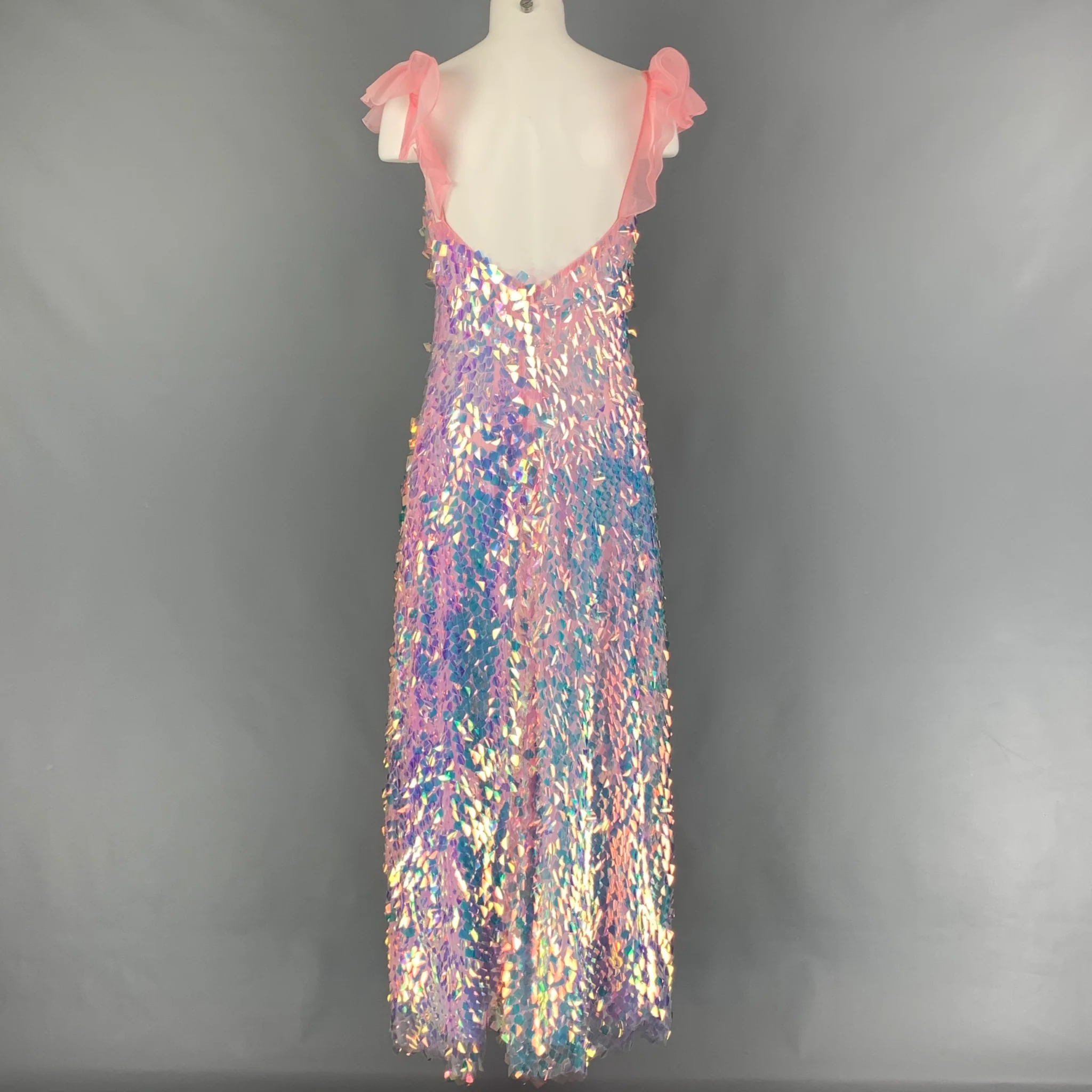 NEUBYRNE 'Mirabella' gown dress comes in a pink silk organza with iridescent paillette sequin design throughout featuring flutter sleeves, front v-neck, back deep v-neck, hook & loop detail, and a hidden back zip up closure.