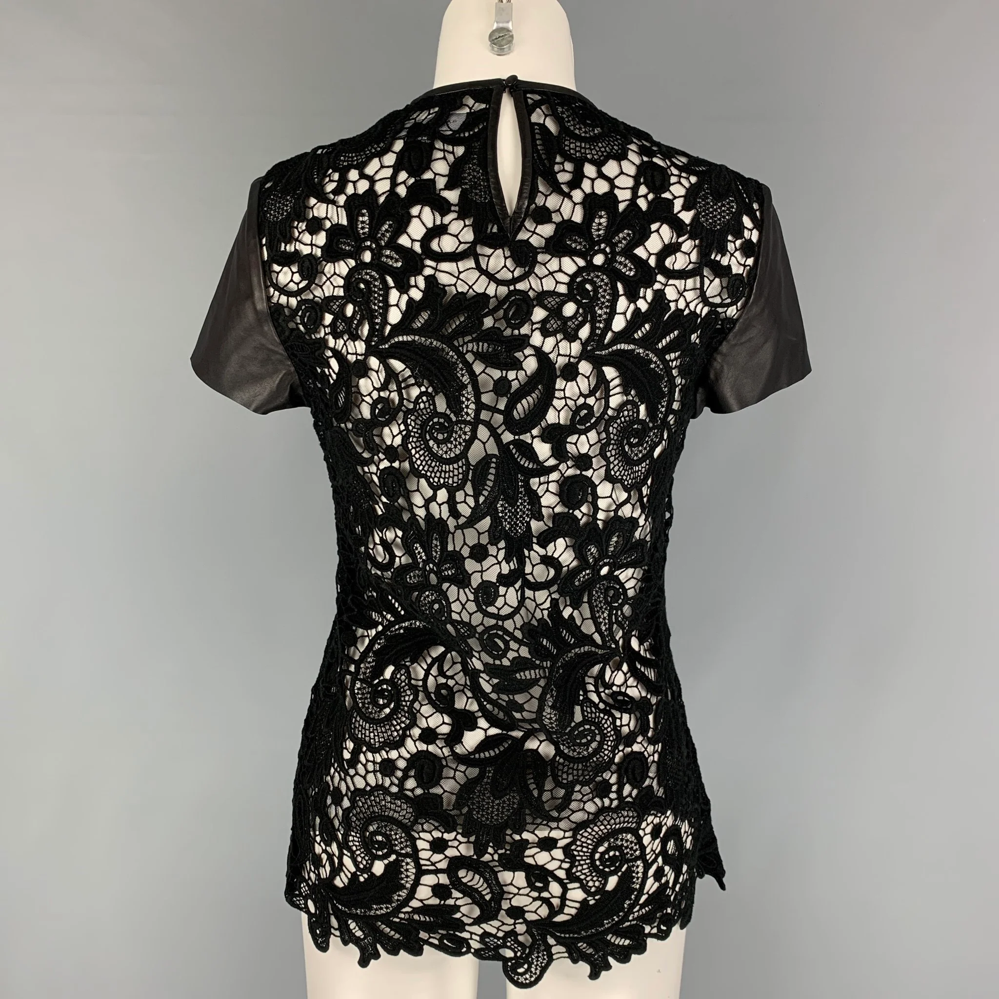 RALPH LAUREN 'Black Label' blouse comes in a black see through lace cotton featuring leather sleeves and a back button closure.