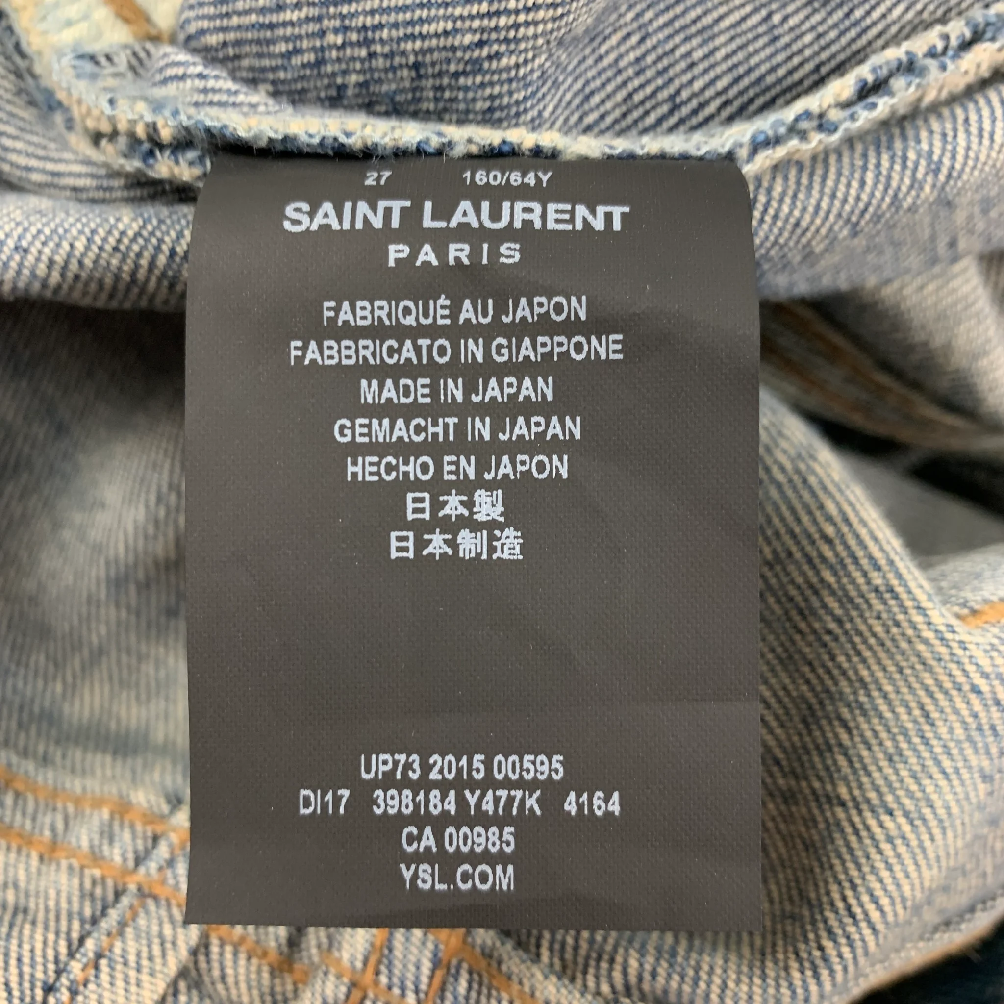 SAINT LAURENT jeans comes in a blue cotton featuring a skinny fit, distressed, contrast stitching, and a zip fly closure. Made in Japan.