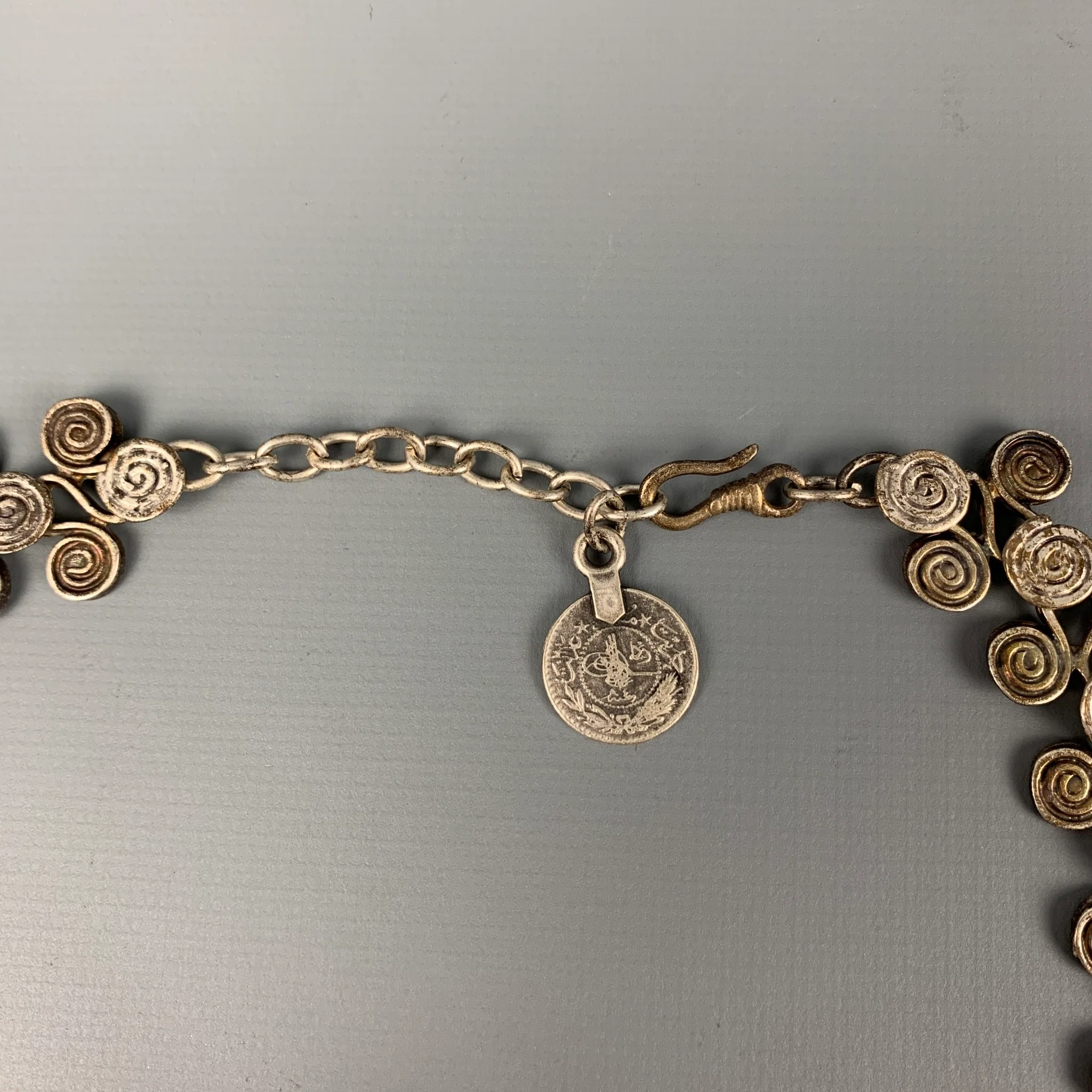 VINTAGE necklace comes in a silver tone metal featuring a coin pendant design, choker style, and a clasp closure.