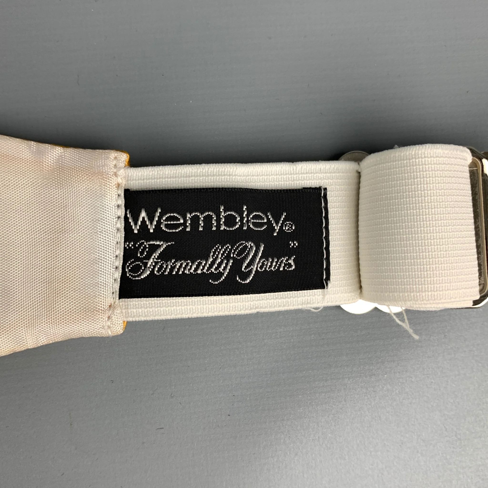 Vintage WEMBLEY cummerbund comes in a gold satin material featuring a buckle closure.